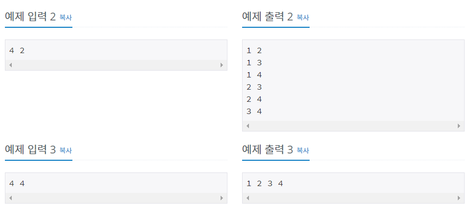 한 줄에 하나씩 문제의 조건을 만족하는 수열을 출력한다. 중복되는 수열을 여러 번 출력하면 안되며, 각 수열은 공백으로 구분해서 출력해야 한다. 수열은 사전 순으로 증가하는 순서로 출력해