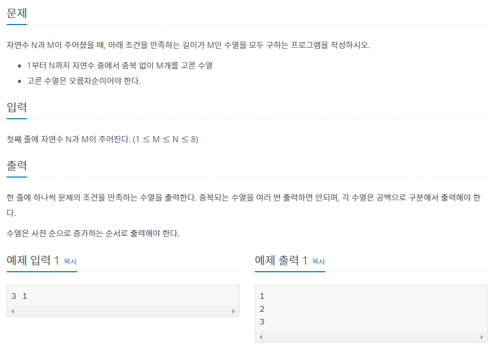15649번은 같은 숫자들로 구성된 수열이어도 순서가 다르면 다른것으로 처리했는데 15650번 문제는 수열이 오름차순이어야 하기 때문에 출력되는 수열들의 수가 많이 줄었다.