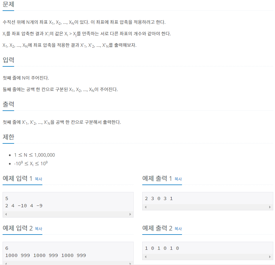 문제 출처 : www.acmicpc.net/problem/18870 Xj를 만족하는 서로 다른 좌표의 개수와 같아야 한다. X1, X2, ..., XN에 좌" data-og-host="www.acmicpc.net" data-og-source-url="https://www.acmicpc.net/problem/..