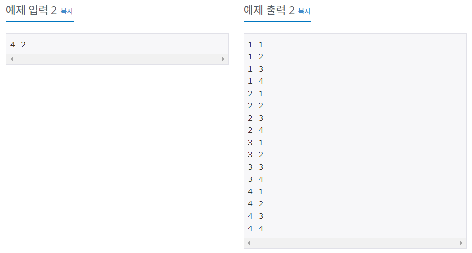 한 줄에 하나씩 문제의 조건을 만족하는 수열을 출력한다. 중복되는 수열을 여러 번 출력하면 안되며, 각 수열은 공백으로 구분해서 출력해야 한다. 수열은 사전 순으로 증가하는 순서로 출력해
