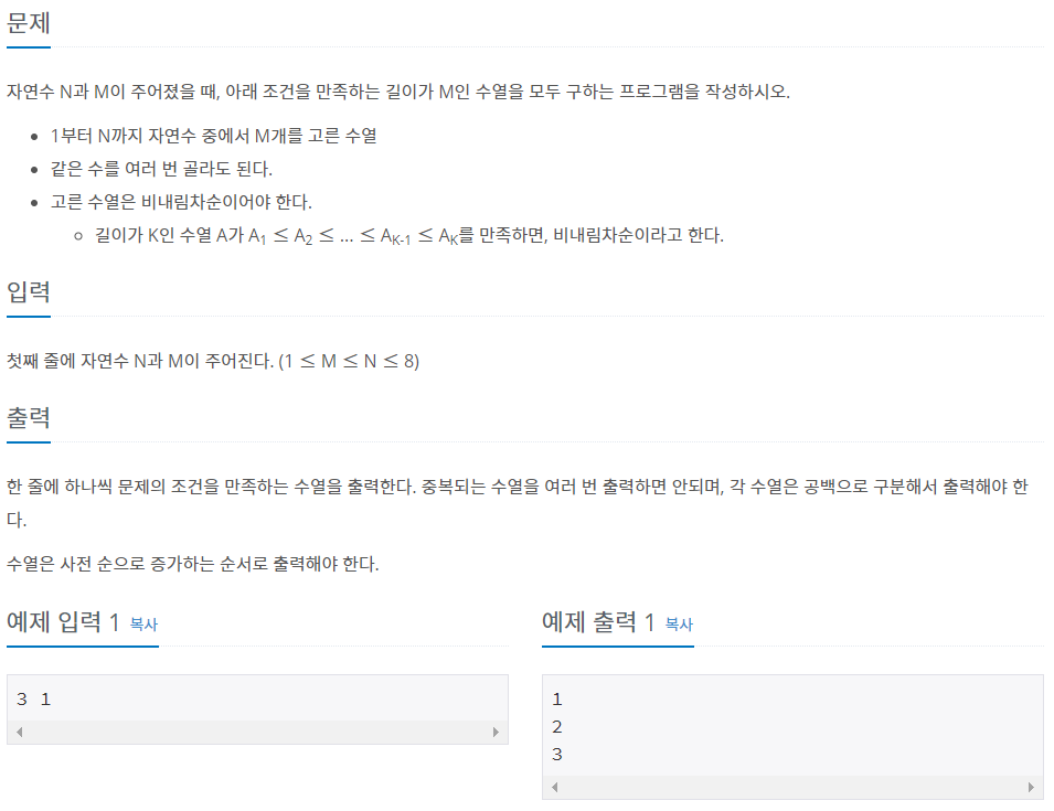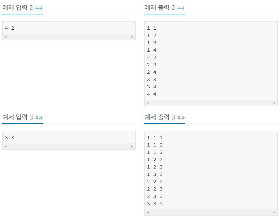 한 줄에 하나씩 문제의 조건을 만족하는 수열을 출력한다. 중복되는 수열을 여러 번 출력하면 안되며, 각 수열은 공백으로 구분해서 출력해야 한다. 수열은 사전 순으로 증가하는 순서로 출력해