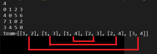 팀을 구할 때 오름차순으로 차례대로 저장했는데 구성을 확인하면 다음과 같다.