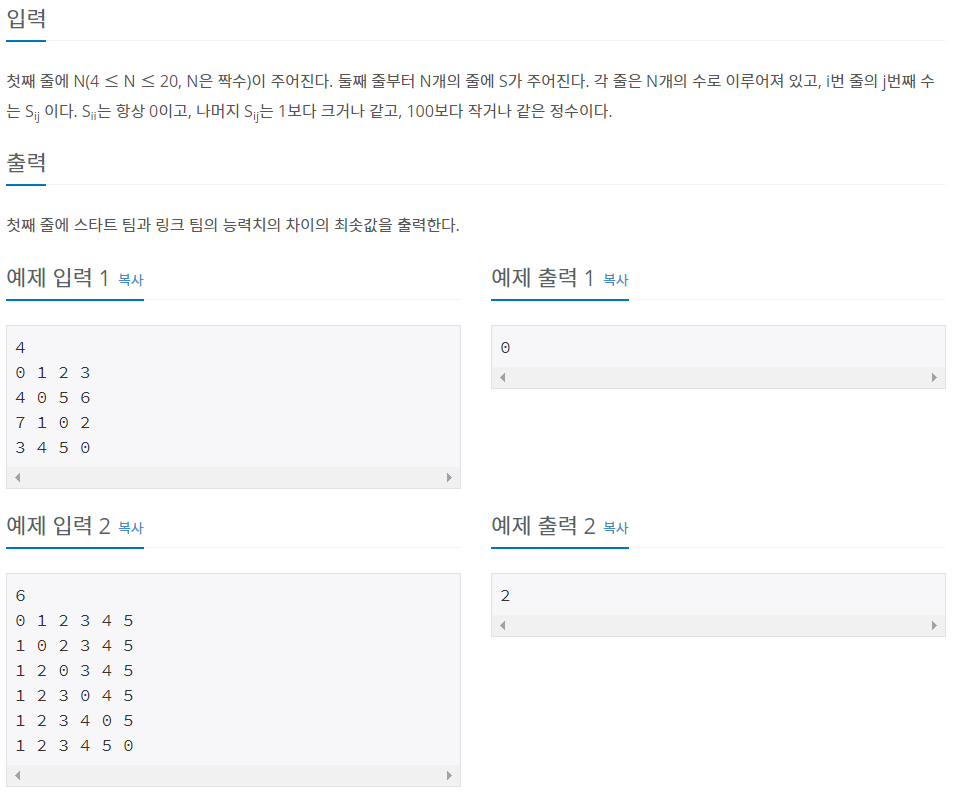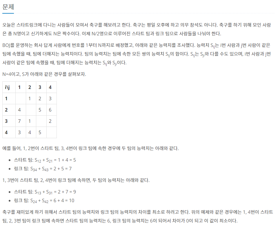 15650번과 다른점은 15650번은 수열을 구한 후 바로 화면에 출력했지만 이번 문제에서는 구한 수열로 팀의 능력치를 구한다.