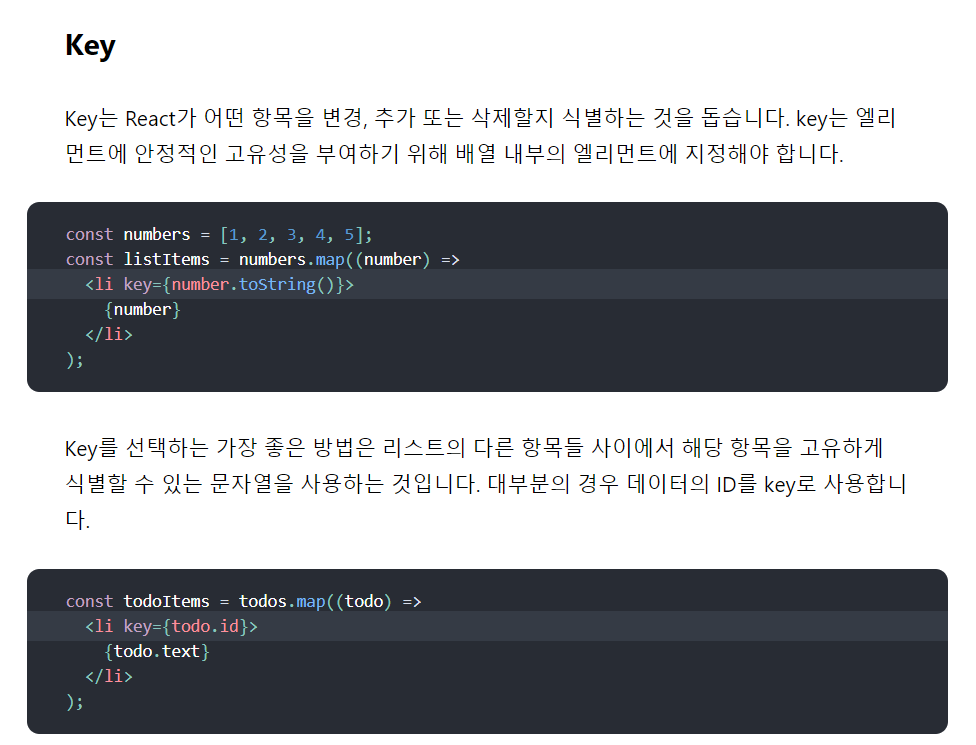 * key값은 배열의 순서가 바뀌지 않으면 {index}를 사용해도 상관없지만 순서나 내용이 변화하는 상황이라면 요소를 특정할 수 있는 key를 사용해야 한다.