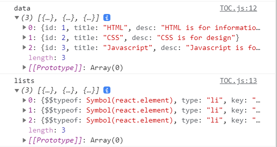 data는 우리가 만든 state가 그대로 전달되었고, 만든 lists는 type:"li"인 react.element이다.