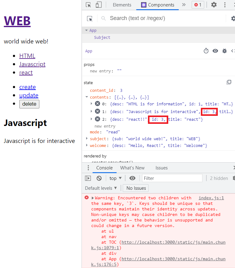 이었는데 CSS를 삭제하고 새로운 react를 create를 통해 만들어주었다. 그랬더니 콘솔창에 경고메시지가 떴다.
