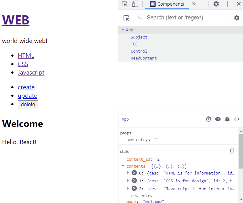 this.setState를 통해 새로운 배열을 contents에 넣고, mode를 'welcome'으로 바꿔 초기 화면으로 바꿔준다.