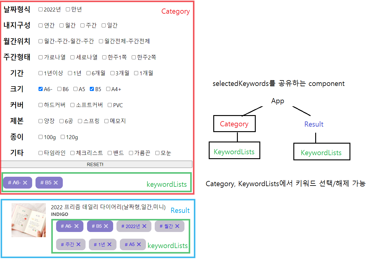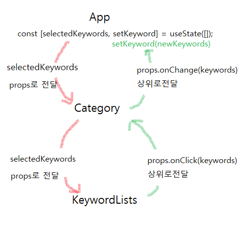 App에서는 전달받은 newKeywords를 setKeywords(newKeywords)로 selectedKeywords를 변경시킨다. App의 state가 변경되었으므로, App이 새로고침되며 하위 컴포넌트들도 새로고침을 통해 selectedKeywords를 전달받아 새로고침하게된다.