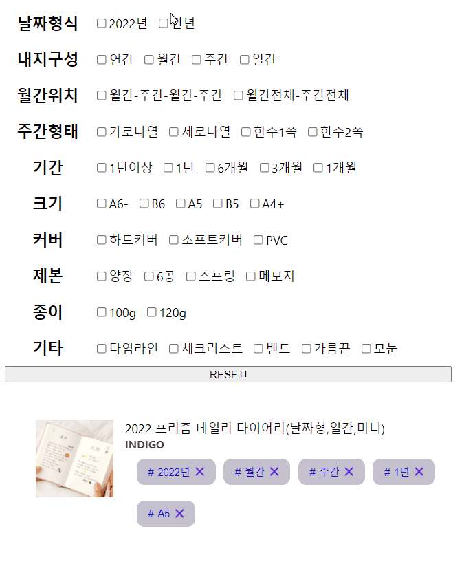 가장 큰 변화는 Category.js인데, state대신 props.selectedKeywords를 사용하니 setState()가 아닌 props.onChange를 통해 변경된 selectedKeywords를 전달했다. 그 하위 컴포넌트인 KeywordLists도 추가하거나 제거한 새로운 selectedKeywords를 Category로 전달하고, Category는 App.js로 전달한다.