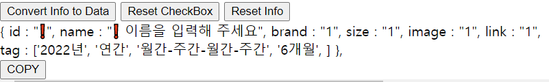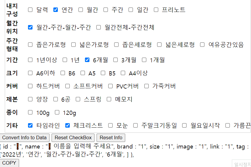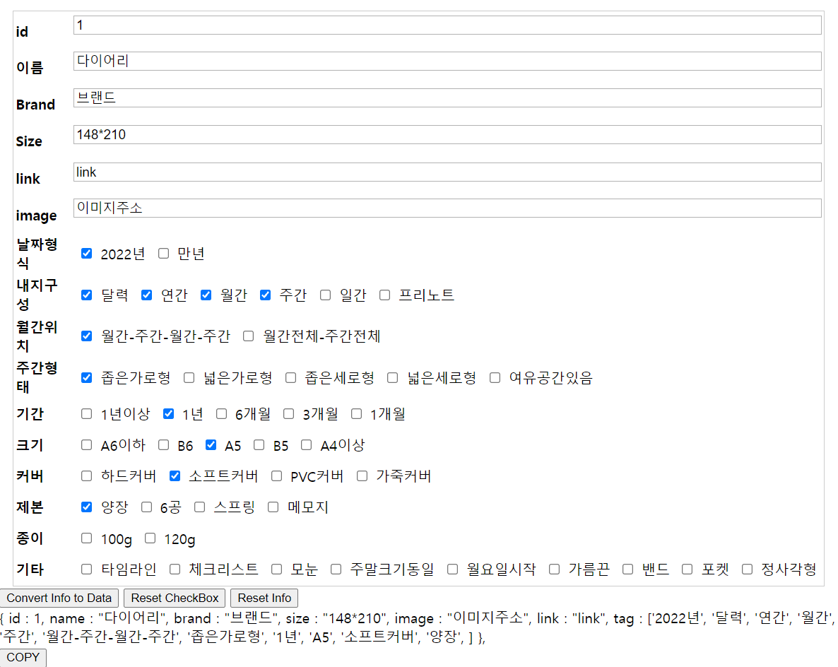 다이어리에 대한 정보들을 JSON 데이터로 저장하려고 하니 생각보다 번거로웠다. 아예 python으로 스크래핑 할까 하다가... 어차피 tag정보는 상세정보 안의 jpg파일에 설명되어 있기 때문에 사람이 보고 확인하는 수 밖에 없었다. 그래서 조금이라도 쉽게 저장하기 위해 원하는 형식으로 정보를 만들어주는 양식을 만들었다.