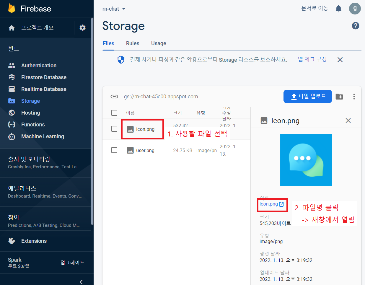 파이어베이스에서 사진을 가져오려면 사용할 사진을 업로드해야한다.