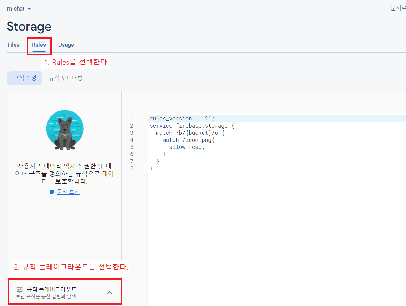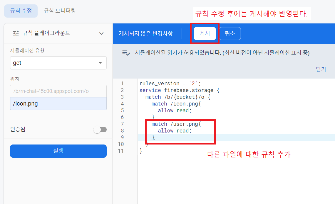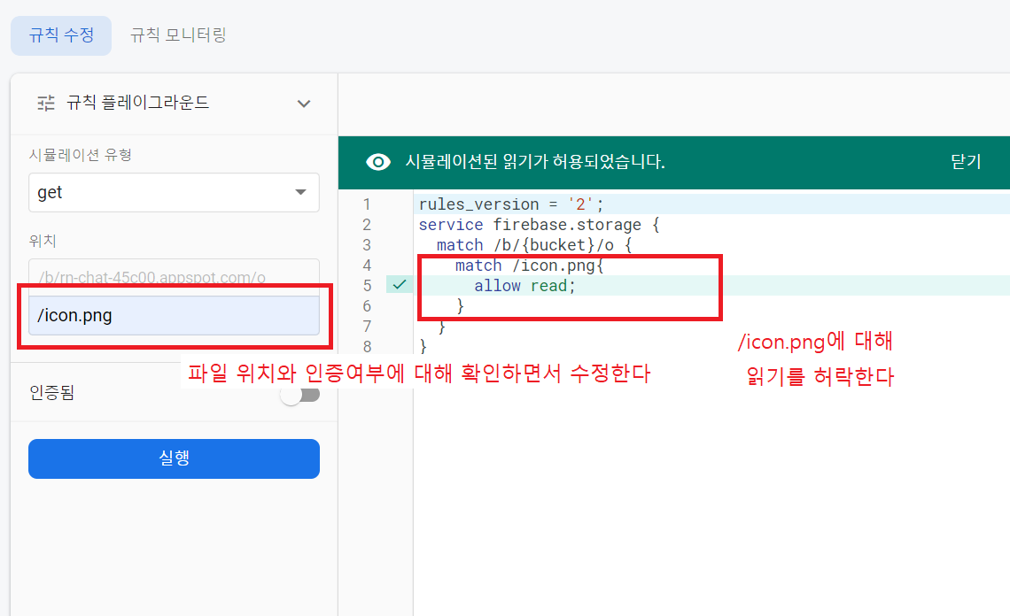 이것은 사용하려면 storage에 접근할 수 있도록 규칙을 설정해야 한다.