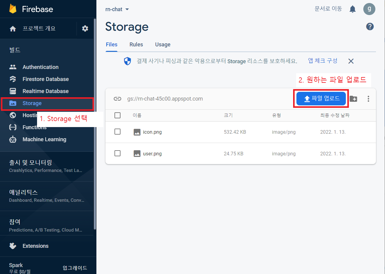 Storage를 시작하고 나면, 원하는 파일을 업로드한다.