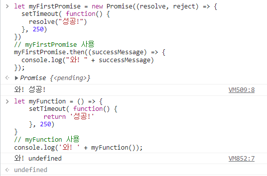 Promise를 사용한 코드는 setTimeout을 통해 받아온 '성공!'을 가져와 사용할 수 있었지만 일반 함수로 작성한 경우에는 setTimeout을 실행하기 전에 다음 코드가 실행되어 undefined를 출력하는 것을 확인할 수 있다.