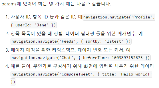 1. navigation.navigate() 함수의 두 번째 변수로 params를 전달해야 한다.