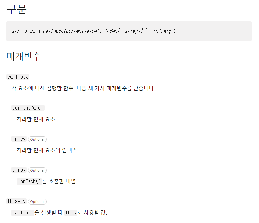 예를 들어 array,forEach의 경우 필수인 매개변수가 있고, 선택적인 매개변수는 Optional이라고 표시되어있다.