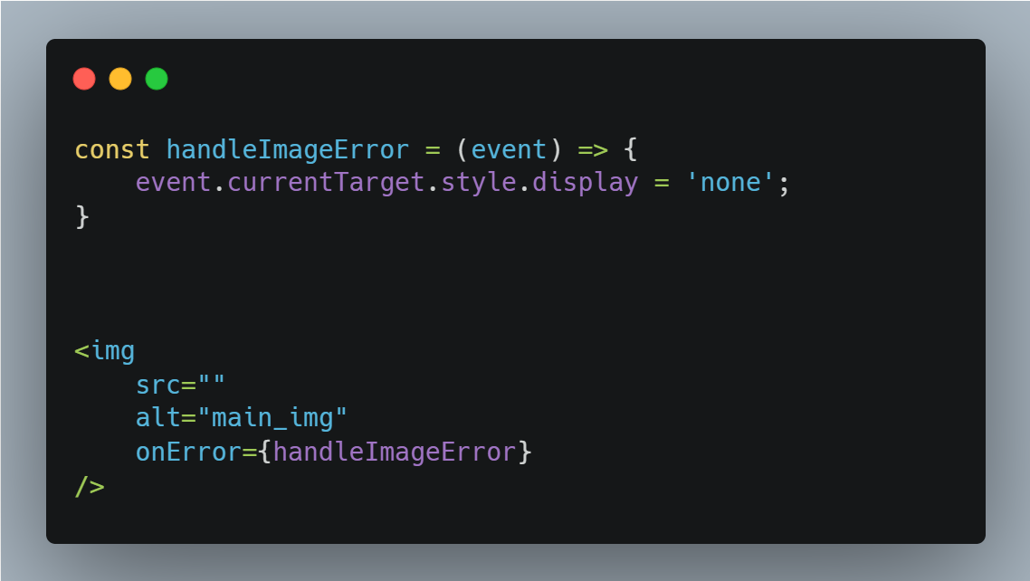 으로 에러가 일어난 이미지 태그가 display = ‘none’상태로 변경해 보이지 않도록 처리한다.