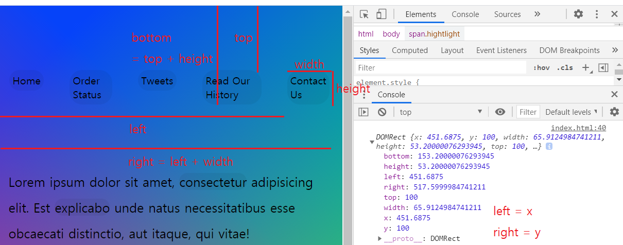 위의 글을 참고해서 정리한 그림이다. <Contact Us> 위에 마우스를 올렸을 때 나타난 DOMRect이다.