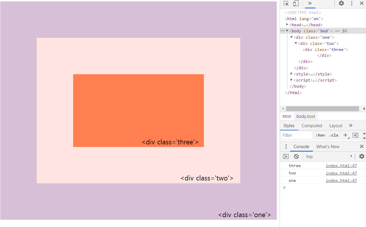 가장 내부의 <div class='three'>를 클릭했을 때 console에 표시되는 내용