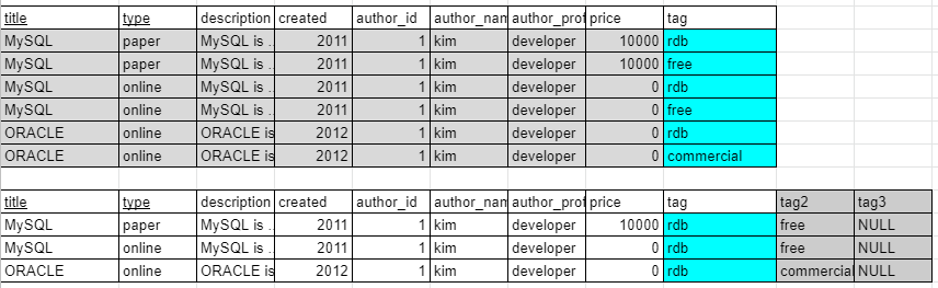 처음 테이블에 tag 컬럼에 값을 하나씩 적어 여러 행을 만들 경우 -> 데이터의 중복이 많아진다