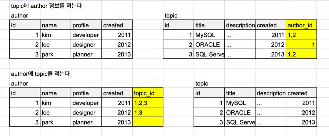 값이 1,2 이런식으로 여러 개의 값을 가지게 되면서 join이 불가능해지고, where을 통해 데이터를 찾을 때도 사용할 수 없게 된다.