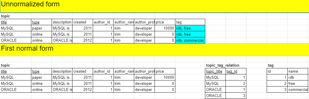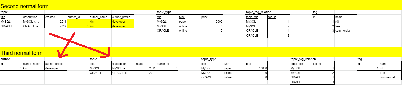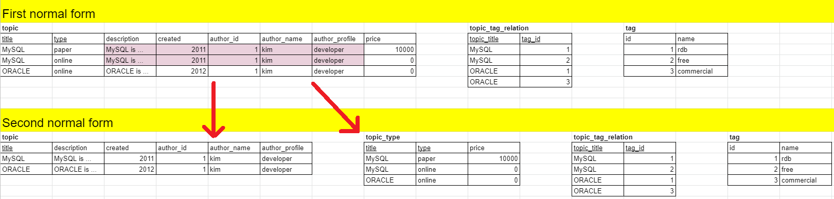 에 영향을 주니까 하나의 topic table을 ①과 ②로 나누고, 중복된 행을 제거한다.