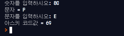 코딩을 할 수 있으면 굳이 외울 필요가 없다. 문자형으로 저장된 변수를 정수형으로 출력하면 아스키코드 값을 구할 수 있다.