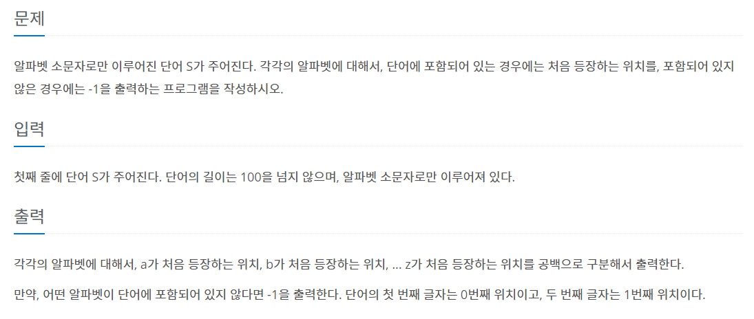 백준 10809번: 알파벳 찾기 - https://www.acmicpc.net/problem/10809