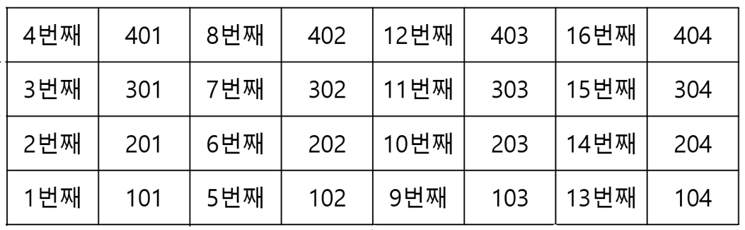 H=4, W=4인 호텔에 손님들을 순서대로 배정할경우 다음과 같다.