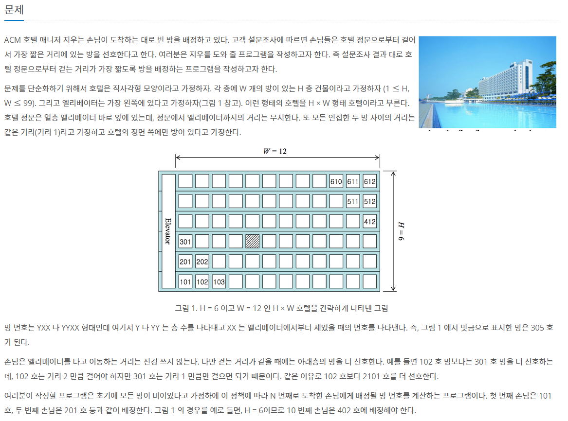 이므로 엘리베이터에서 가까운 방부터 배정한다. 1호들부터 101호, 201호, 301호... H01호까지 배정한 후 102호, 202호, 302호... H02호까지 배정한다. 그러므로 객실 배정은 H(호텔의 층 수)와 관련되어있다.