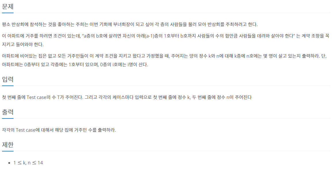 이 방법은 k와 n의 수가 적을 땐 비효율적인 방법이다. 굳이 14층 14호까지 구할 필요가 없기 때문이다.