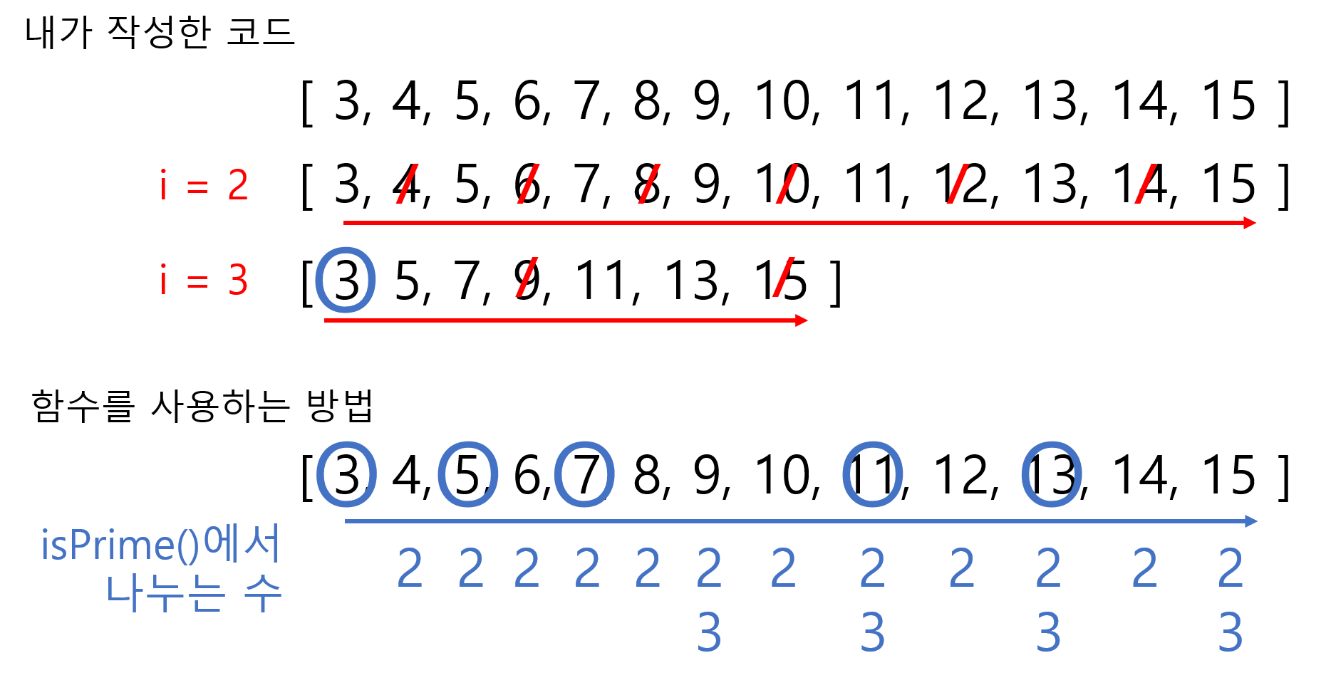 수가 적을 때는 크게 차이가 나지 않지만 확인해야할 수들의 개수가 많아지면 위의 방법에서는 크기가 큰 list를 여러번 탐색하며 확인해야되서 시간이 많이 걸린 것 같다.(나누는 수인 i가 적다고 해도)