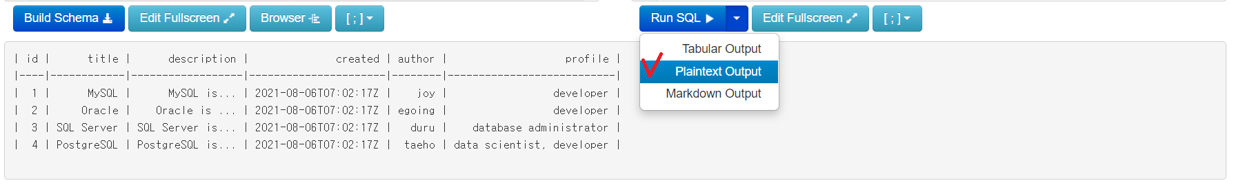 Run SQL 버튼을 눌러 Plaintext Output을 누르면 일반 텍스트 문자열로도 결과를 확인할 수 있다.