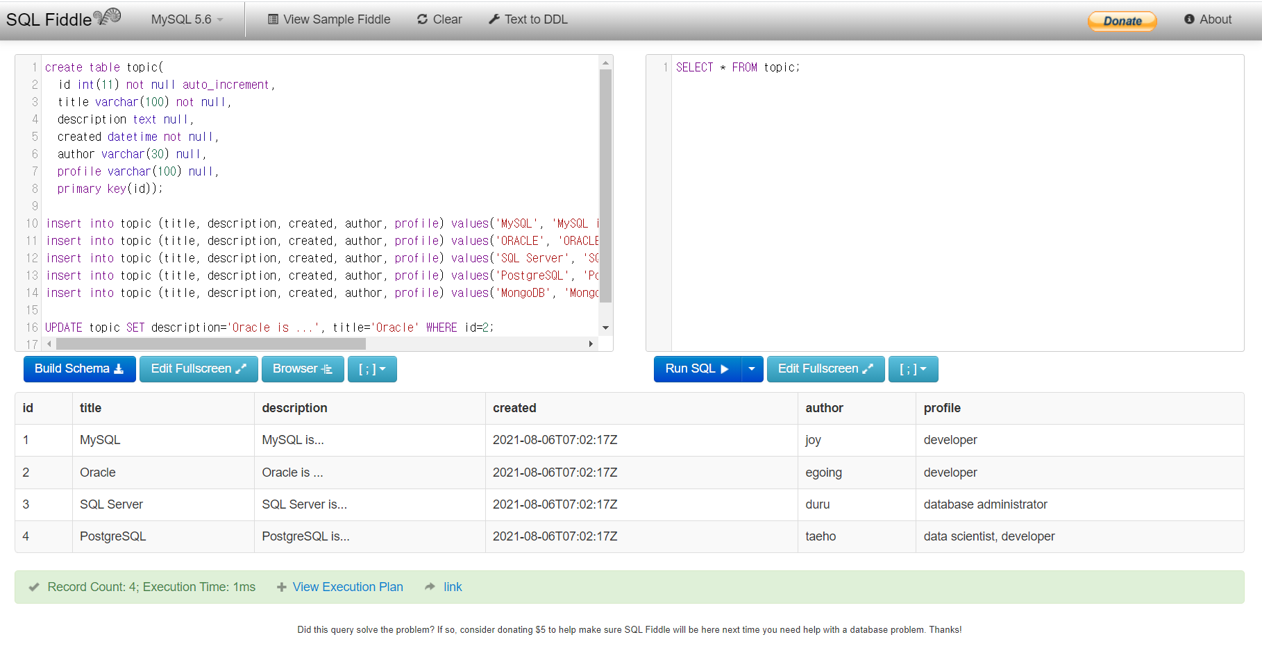 repl과 SQL Fiddle에 대한 자세한 사용법이 필요하다면 아래 사이트들을 방문하면 좋을 것 같다.