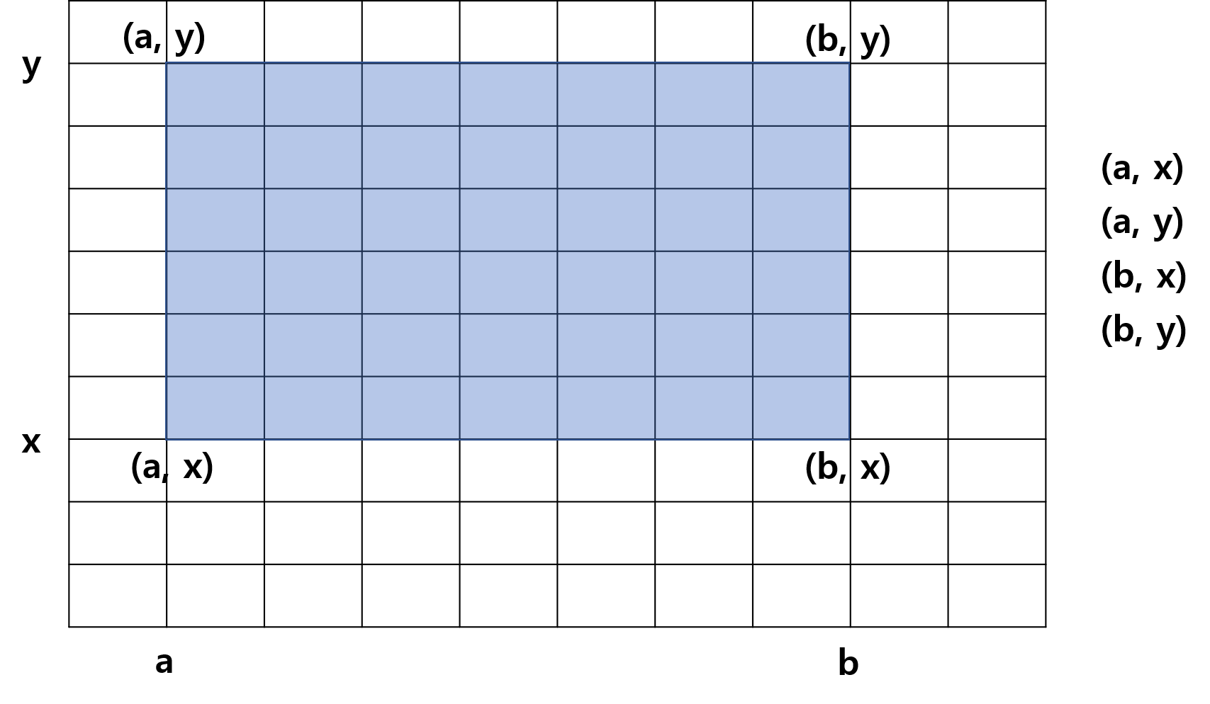 모든 좌표값을 모아서 본다면 x축은 a가 2번, b가 2번 사용되고 y축은 x가 2번, y가 2번 사용된다.