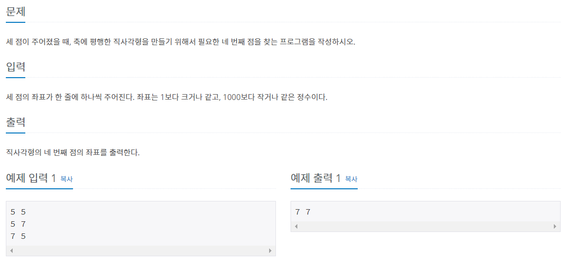 세 점이 주어졌을 때, 축에 평행한 직사각형을 만들기 위해서 필요한 네 번째 점을 찾는 프로그램을 작성하시오.