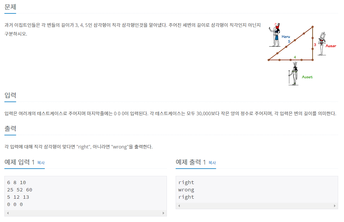 처음엔 예제의 입력값들이 작은 수에서 큰 수 순서대로 입력되길래 피타고라스 정리만 확인하도록 작성했더니 틀렸다고 나와서 가장 큰 수를 고르는 작업을 추가했다.