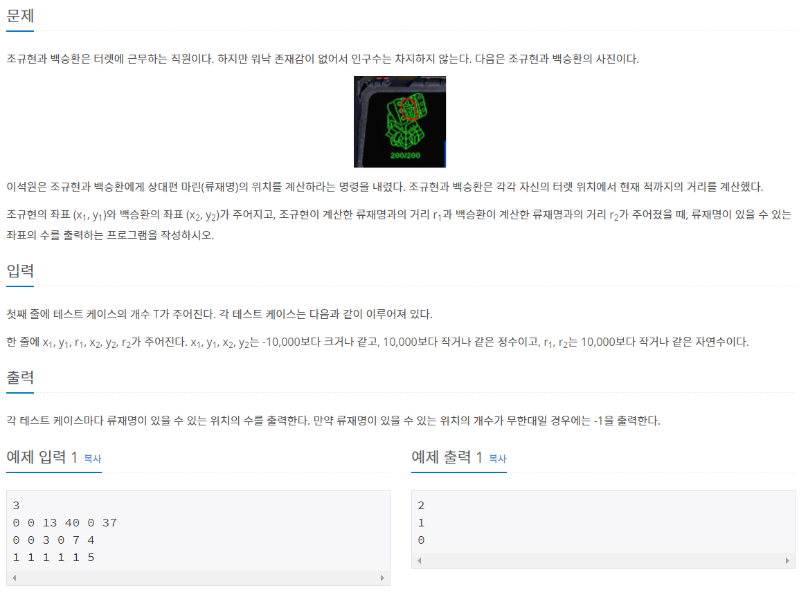 두 원의 접점의 개수를 구하는 문제다. 기하학 문제를 푼게 너무 오랜만이어서 여러가지 조건을 빠뜨리지 않는 것이 까다롭게 느껴졌다.