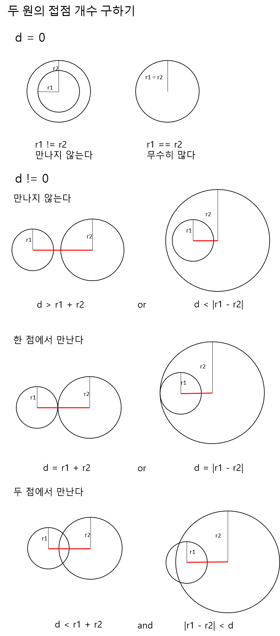 두 원의 중심, (x1, y1)과 (x2, y2)사이의 거리가 0인 경우와 아닌 경우로 크게 나눠서
