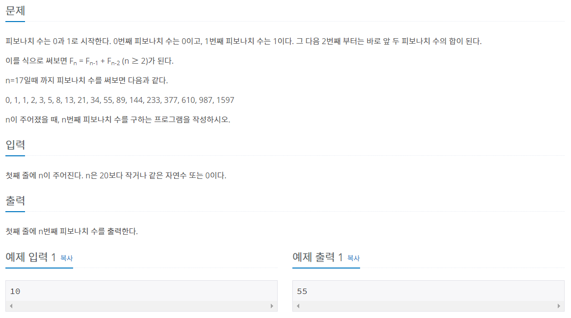 피보나치 수는 0과 1로 시작한다. 0번째 피보나치 수는 0이고, 1번째 피보나치 수는 1이다. 그 다음 2번째 부터는 바로 앞 두 피보나치 수의 합이 된다. 이를 식으로 써보면 Fn = Fn-1 + Fn-2 (n ≥ 2)가