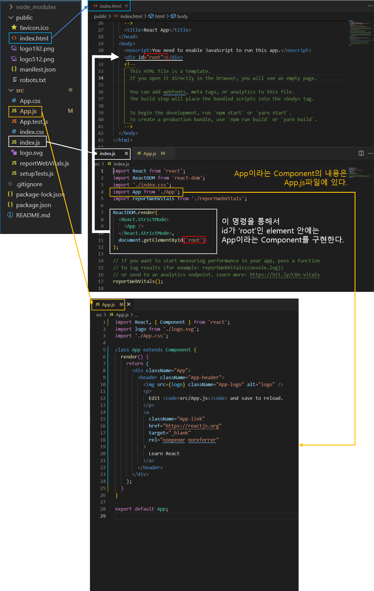 라는 코드를 통해 id가 'root'인 element에 <App> Component를 render 했다.