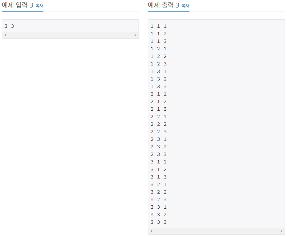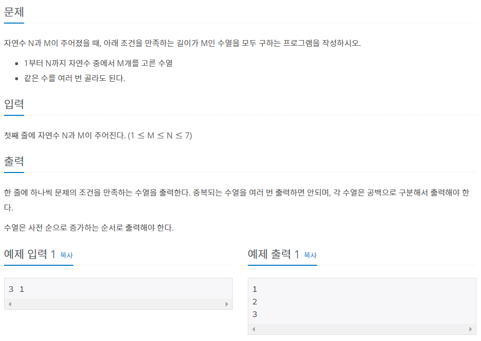 15651번이 이전 문제들과 다른 점은 수열을 중복된 수로 구성할 수 있다는 점이다.