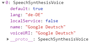 getVoices()를 통해 가지고 온 SpeechSynthesisVoice가 가지는 속성은 아래와 같다.